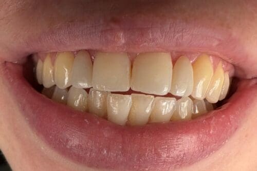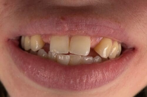 Due to the discoloration of previous tooth bonding, this patient's smile was in need of rejuvenation. Dr. Cook placed dental crowns to replace this previous service.